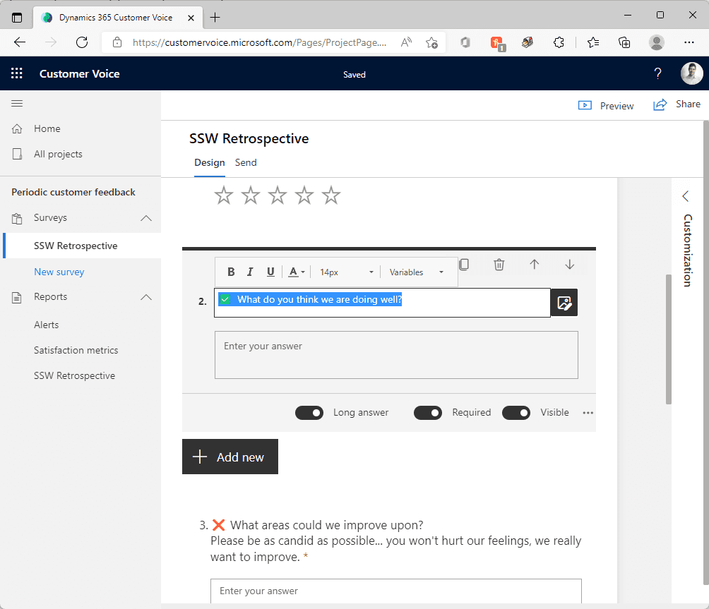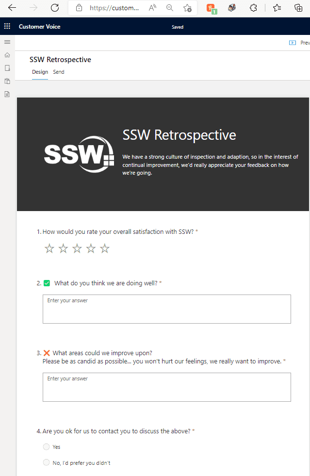 Figure: Survey Creation If you are running Scrum projects, and your clients are used to doing Sprint Retrospectives, it makes sense to frame the questions in the same way (what went well, what didn’t, and what should we change?).