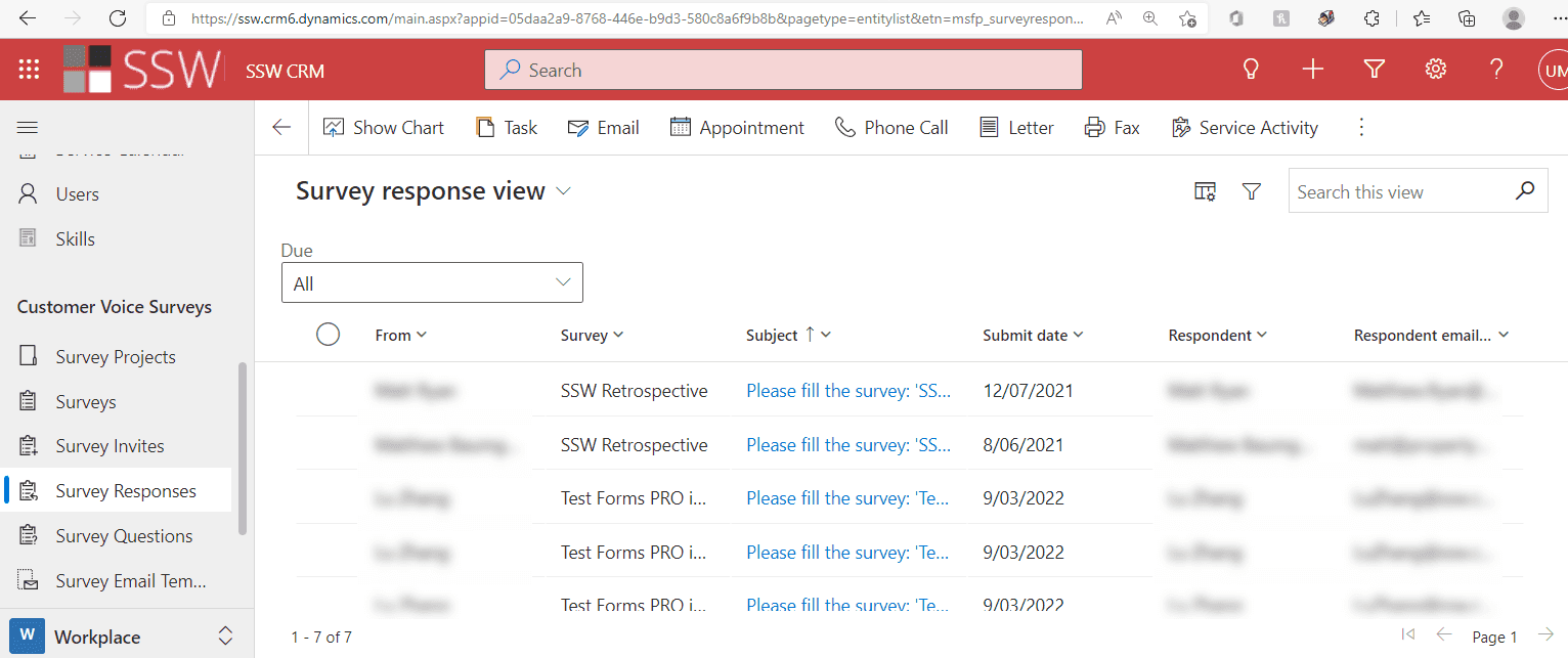 Figure: Customer Voice Survey section of Dynamics showing Survey Responses all together If you’re a company that cares more about qualitative information than quantitative (e.g. you run few large projects rather than many small ones), then it’s a good idea to also make sure you set up email notifications when responses come in so that you don’t miss them, and you can analyze each one individually.