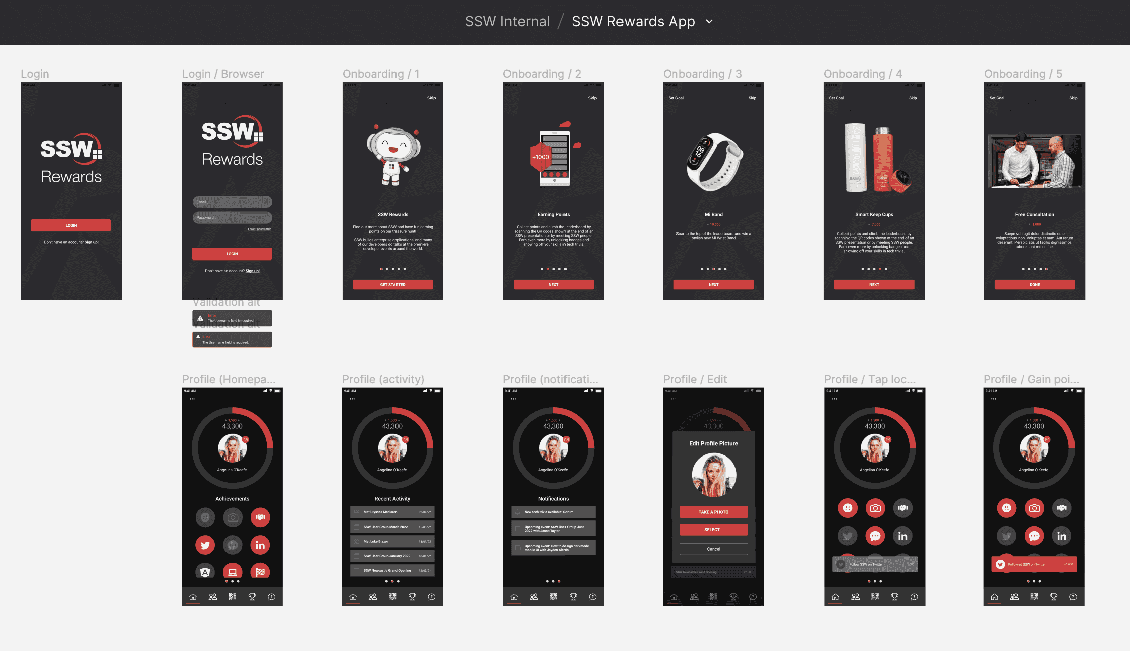 Figure: Good example – High fidelity mockup for SSW Rewards App - recommended as quick to update when changes are requested Use a design tool such as Figma to create high-fidelity mockups of a website or app's interface. This should include more consideration of UX and detailed UI elements such as buttons, forms, icons, and typography.