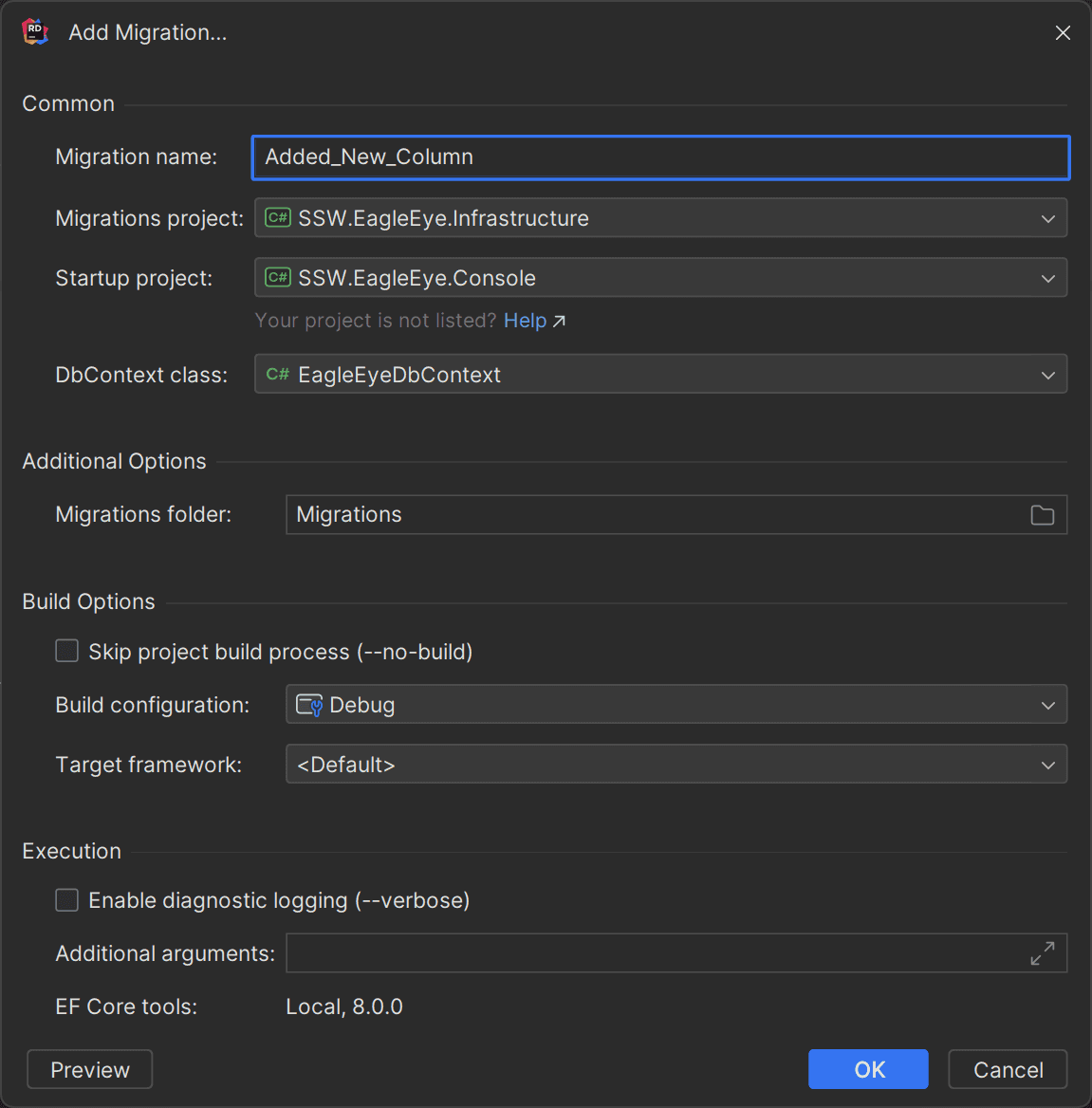If you struggle to remember the commands above, Rider has a great UI that makes creating migrations easy. This is especially useful when you have different projects for both startup and migrations.