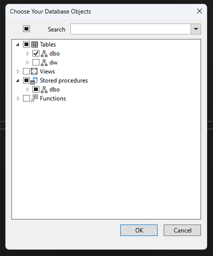 Figure: Data Connection - Choose your database objects (tables, views, stored procedures, etc.)