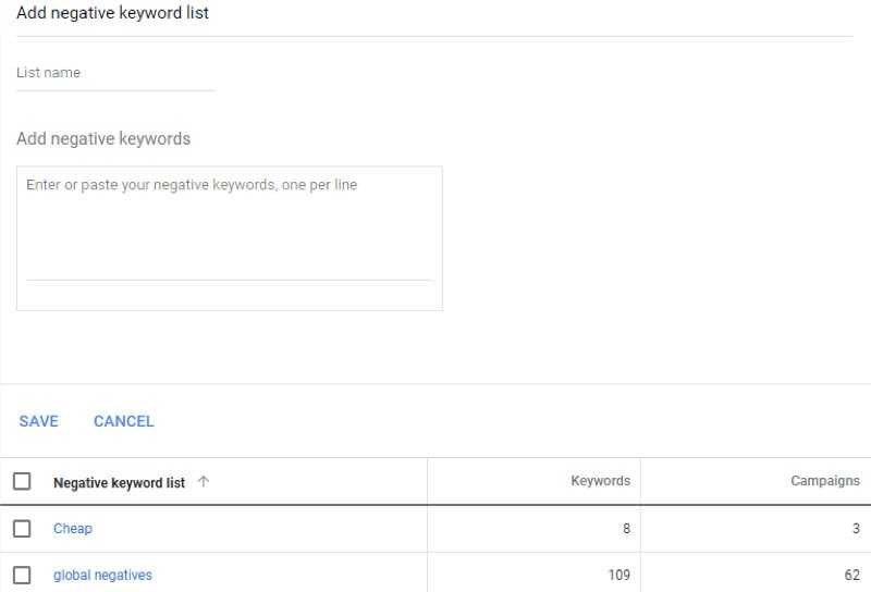 It's important to create specific negative keyword lists depending on your business. You can have different lists named “cheap" or “career" related. Or you can have a global list that would be applied to all of your campaigns (recommended)