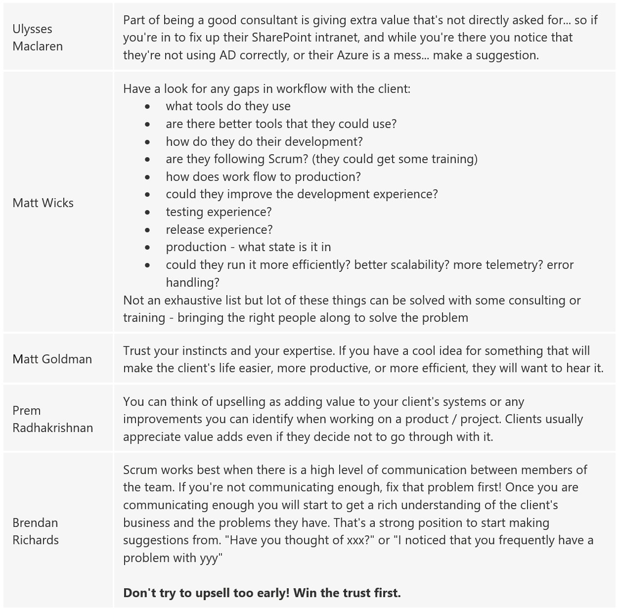 From the above video, you can see that the software consultants at SSW completed a Microsoft Form with the question: Your advice: Pretend you are talking to a junior dev about this concept of upselling. What do you say to them? Here were some stand out answers:
