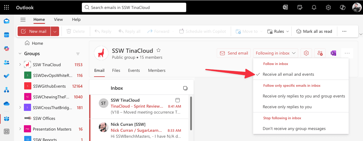 How to follow an Outlook Group in your inbox