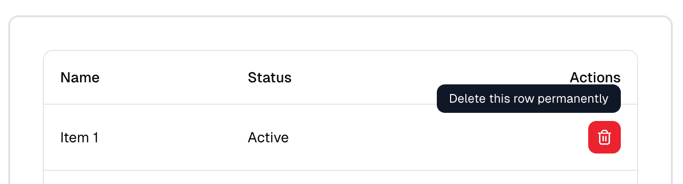 For icon-only delete buttons (for example, a red trash icon in a table row), always provide a tooltip on hover or focus.