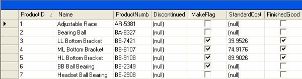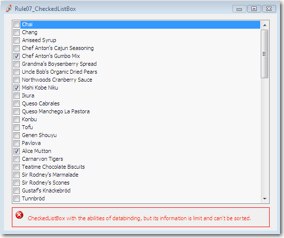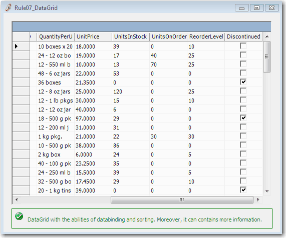 ProductsService.Instance.GetAll(Me.ProductsDataSet1)CheckedListBox1.DataSource = Me.ProductsDataSet1.Tables(0)CheckedListBox1.ValueMember = "ProductID"CheckedListBox1.DisplayMember = "ProductName"For i As Integer = 0 To CheckedListBox1.Items.Count - 1Dim checked As Boolean = CType(ProductsDataSet1.Tables(0).Rows(i)("Discontinued"), Boolean)CheckedListBox1.SetItemChecked(i,checked)NextFigure: 8 lines of code to fill a CheckedListBoxProductsService.Instance.GetAll(Me.ProductsDataSet1)Figure: One line of code to fill a DataGridBut the CheckedListBox is useful if only one field needs displaying.