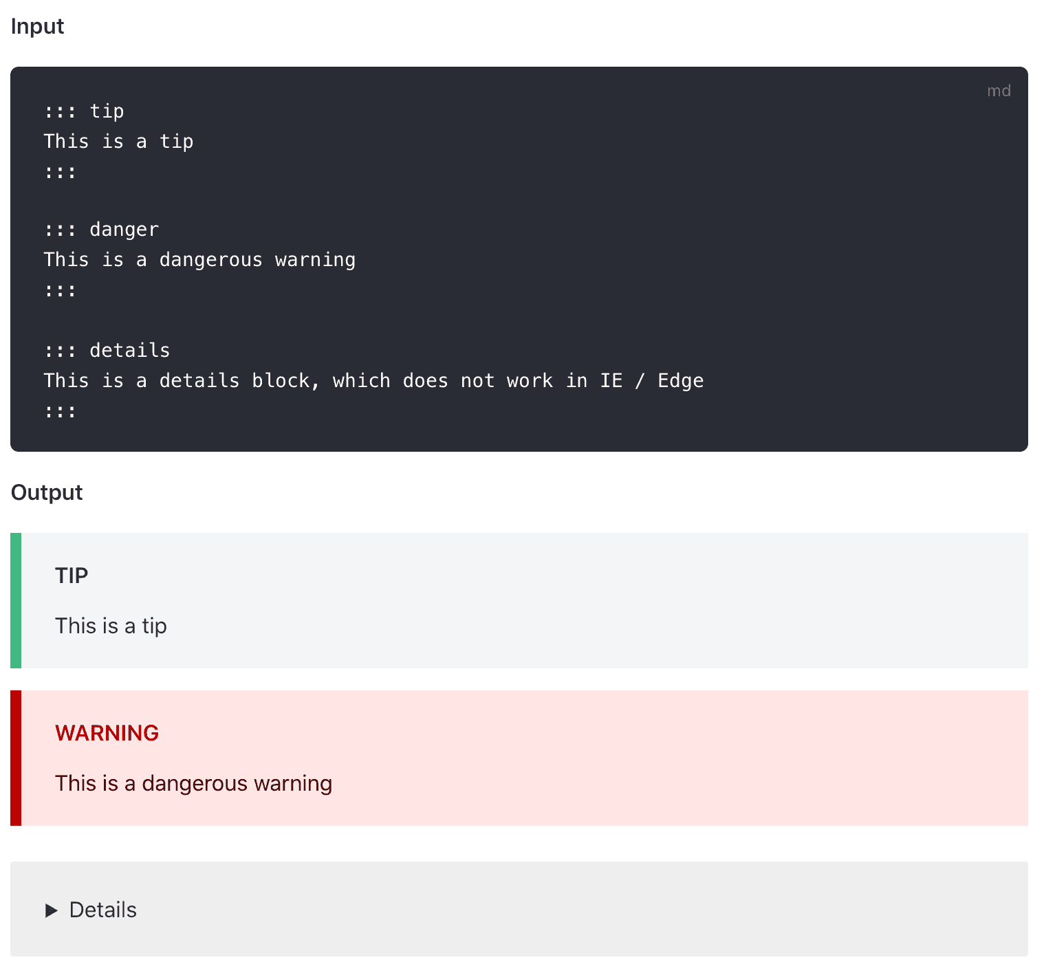 Figure: Good example – VuePress has a custom container that generates nice alert boxes like Bootstrap but without tying the presentation to the CSS framework in the content Unfortunately, Markdown does not support YouTube videos embedding out of the box. However, there is a workaround to embed it.