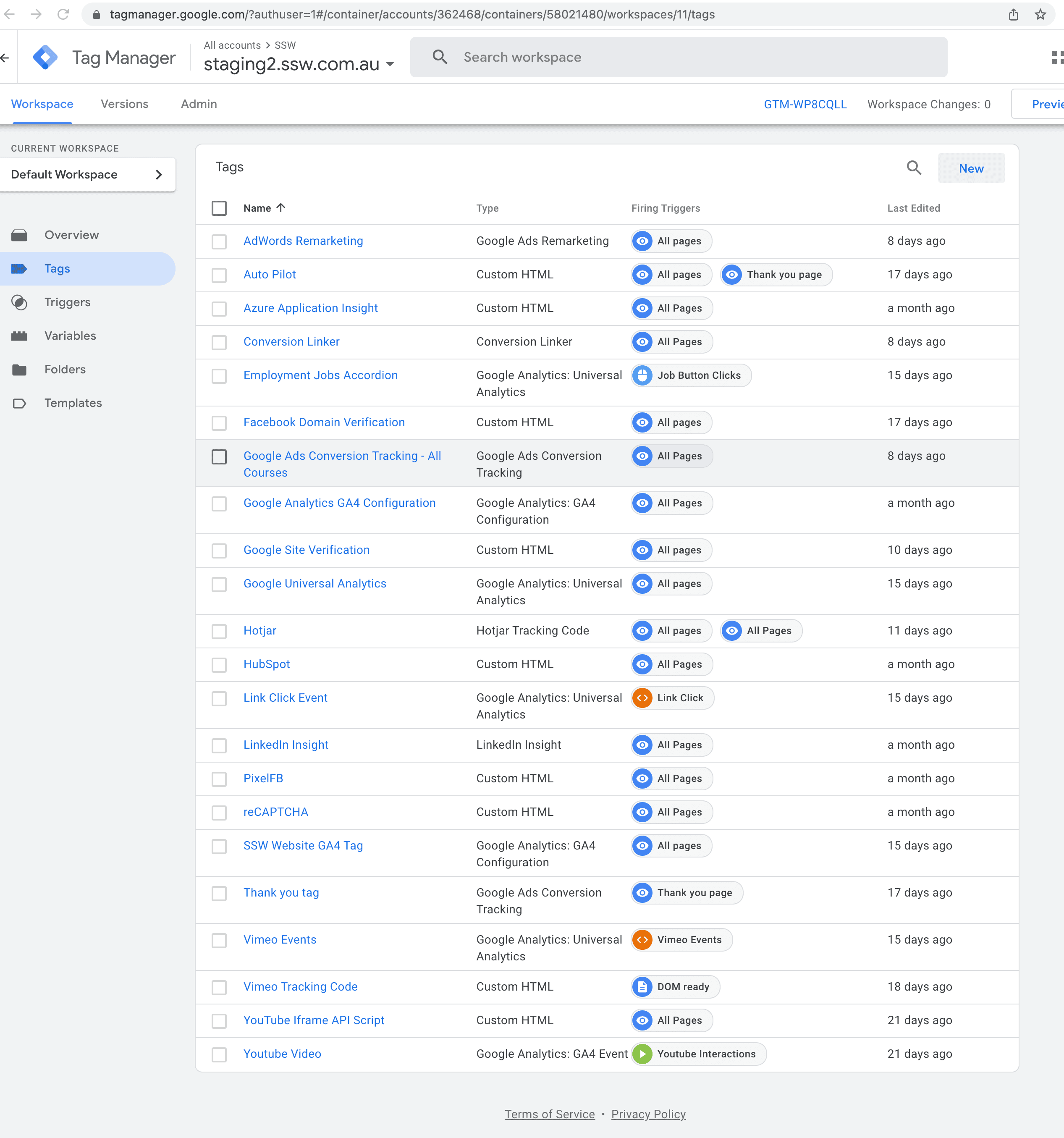 Figure: All tags are added in new SSW.Website using GTM Data and analytics result has recorded by Google Analytics on new SSW.Website. Universal Analytics and GA4 are configured in Google Tag Manager.