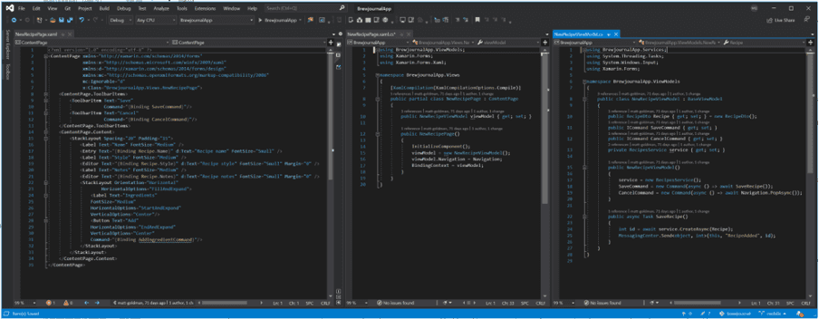 Figure: Good Example - Values are bound to properties of the ViewModel, and actions are bound to Commands in the ViewModel .NET MAUI supports MVVM out of the box, but there are several MVVM frameworks available that enhance this functionality. For example, some MVVM frameworks support "convention over configuration", allowing you to just code your View and ViewModel and let the framework hook them up for you. Some include: