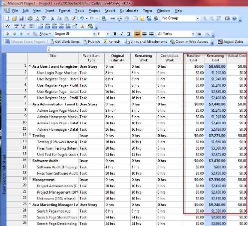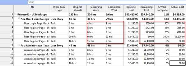 When your project is running, your developers will update the “Remaining Work” and “Completed Work” columns from TFS, they may not use MS Project so you will need to refresh your MS Project file to get these changes, and the $ will be calculated on the fly to give you up-to-date status.
