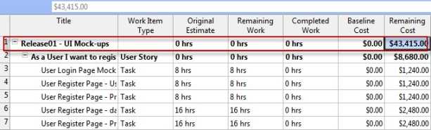 In order for MS Project to calculate and display a total cost for your current release you will need to add a summary task at the top level of the project tasks.