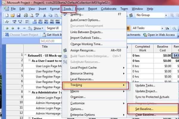 To set a baseline, choose “Tools, Tracking, Set Baseline” from the menu:
