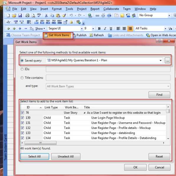Figure: To select the work items that you want to use you should click on “Get Work Items” and choose a query