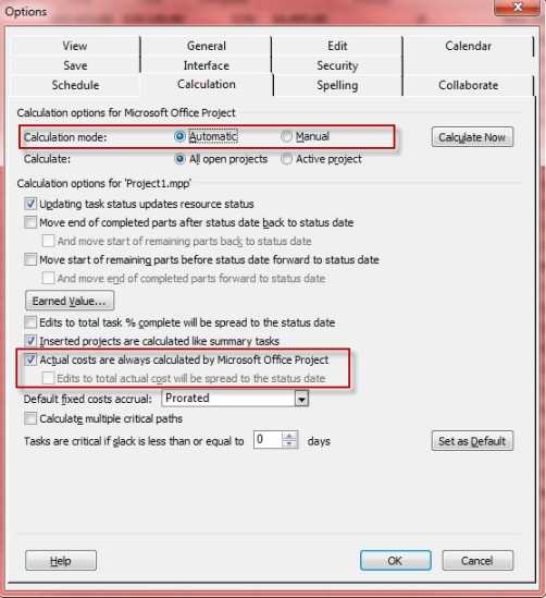 Also make sure “Actual costs are always calculated by Microsoft Office Project” is enabled.