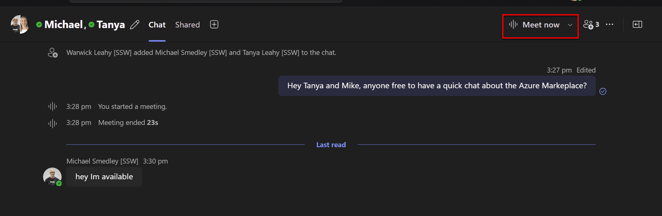 Figure: Good example - The user sends the group a message and then presses the "Meet Now" button which doesn't interupt the entire group When to use "Meet Now"