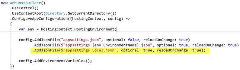 Figure: #2 Add code to apply this configuration file in Program.cs Now, any new developer that needs a custom connection string (or any other configuration setting) can create their own appsettings.Local.json file without affecting any other team member’s configuration.