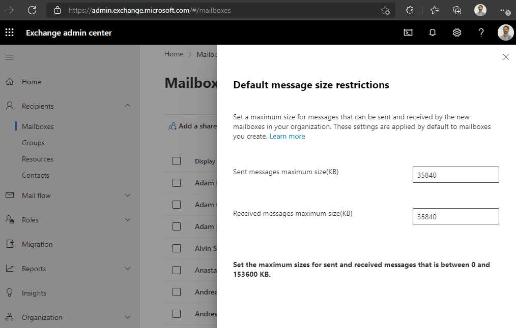- Go to Exchange admin center | Recipients | Mailboxes | Set default message size restrictions