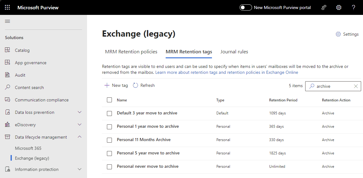 Figure: Microsoft Purview | MRM Retention tags For more information see Microsoft's documentation: https://learn.microsoft.com/en-us/purview/archive-mailboxes?WT.mc_id=M365-MVP-33518