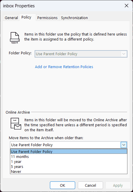 Figure: Outlook | Online Archive mailbox Archive Policies
