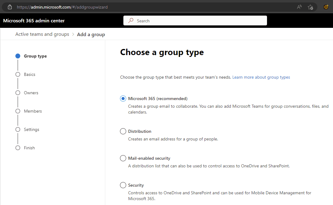 Figure: Choosing a group type in Microsoft 365 #1 Microsoft 365 groups
