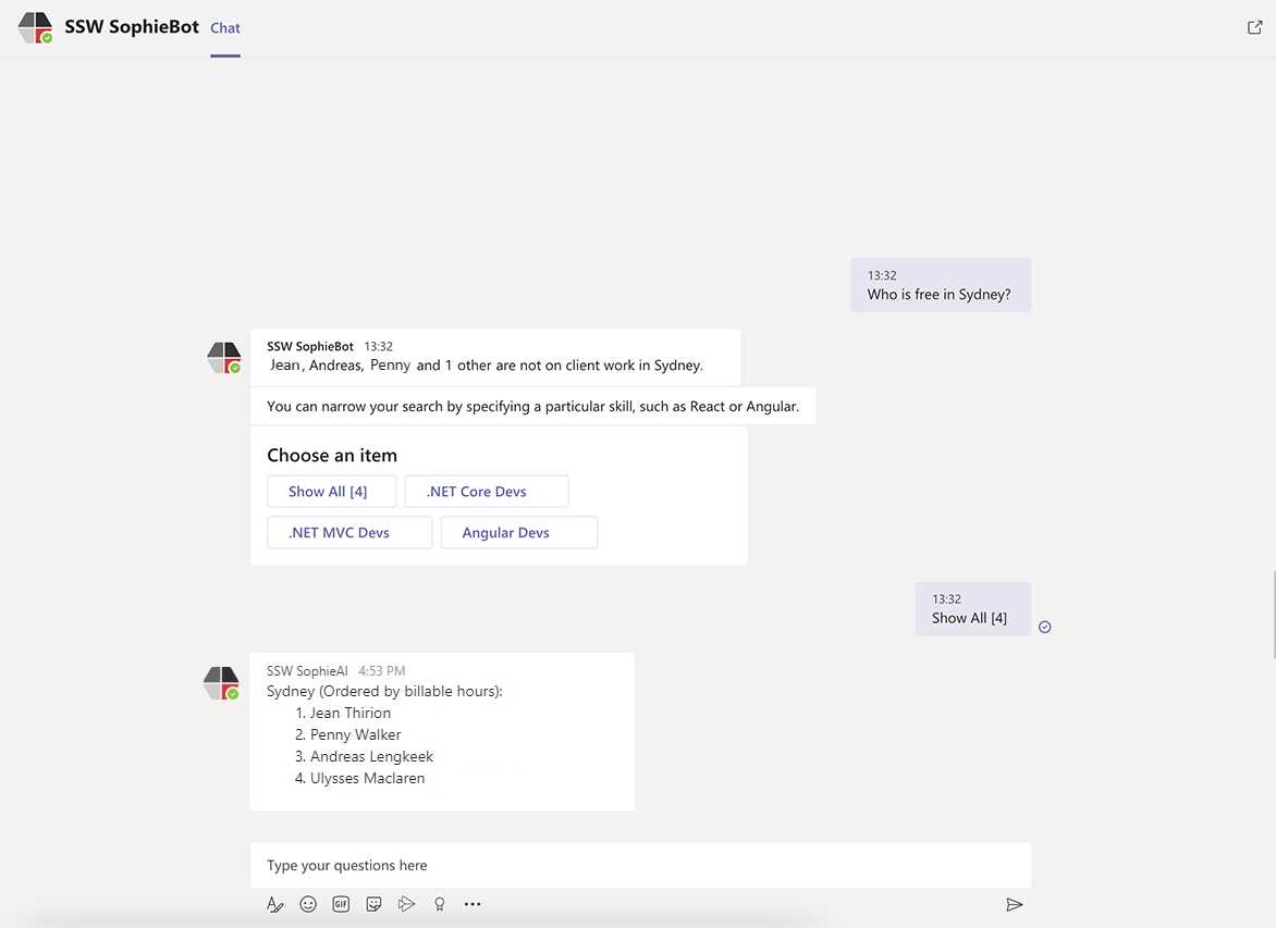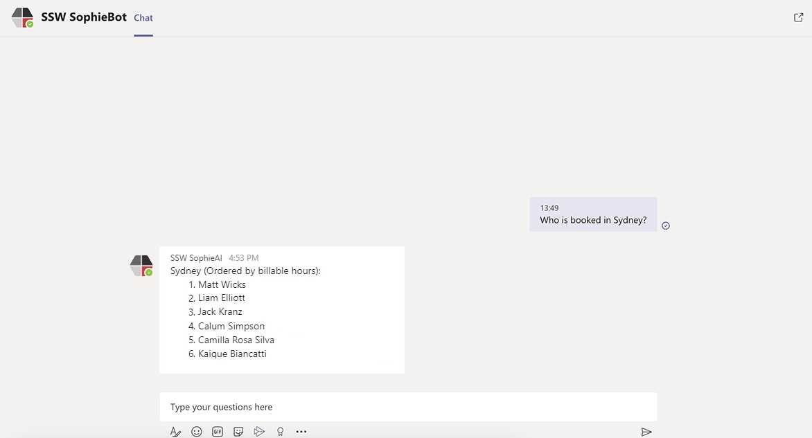 Figure: You can use SophieBot to provide a staffing report of who is physically in the office today
