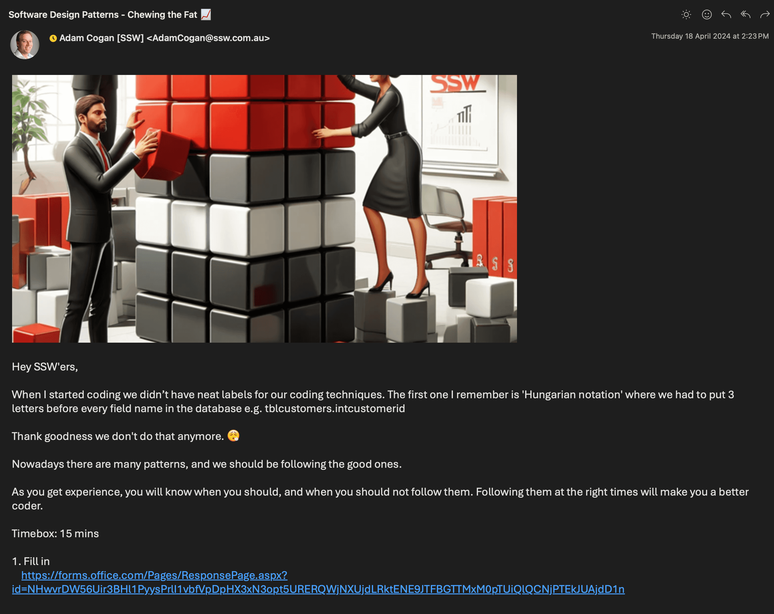 Figure: Chewing The Fat - weekly email and form sent to every SSW Employee SSW also gets employees to do at least one induction item per week until there are none left.
