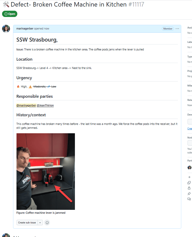 Example: “Created PBI: Defect – Broken coffee machine in SSW France kitchen”