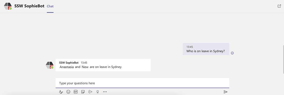 Figure: SSW SophieBot to answer “Who is on leave? [ANSWER: 2 people] - If staff are missing or otherwise unaccounted for, make sure to take appropriate action to find out where they are and why they haven't been in communication