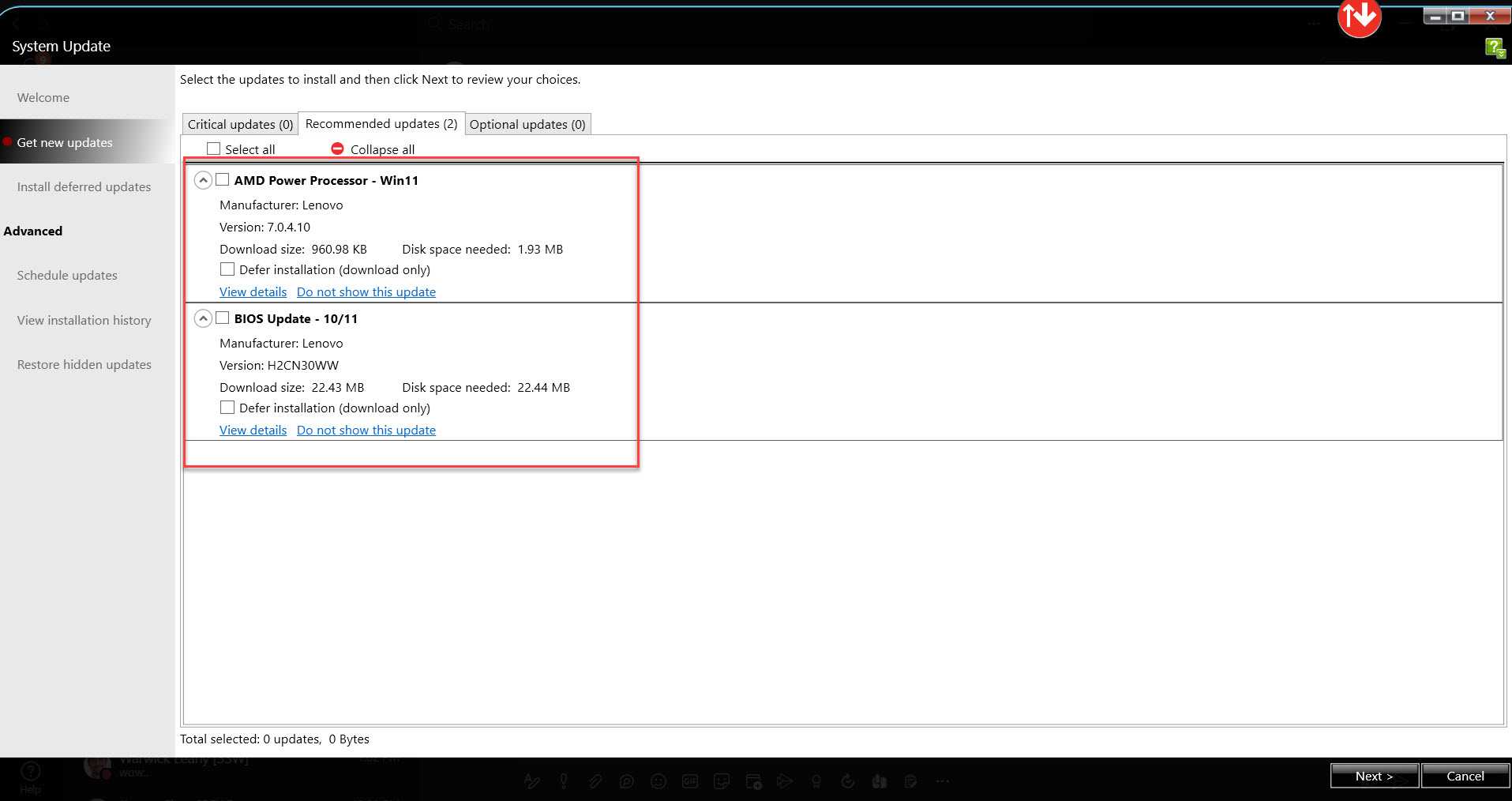 Figure: Lenovo System Update - Install updates (Recommended) - Still, if the issue isn't fixed, report it to SysAdmins by sending an email that should include the steps that you have done to troubleshoot the problem.