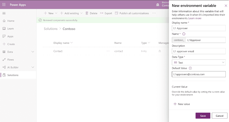Figure: Create a new Component If your Power Apps solution has any environment-specific configuration items, then an Environment Variable in the Solution gives you a configurable input parameter. Environment variables avoid hardcoding configuration information and having to keep track of and change configuration data when importing a solution.