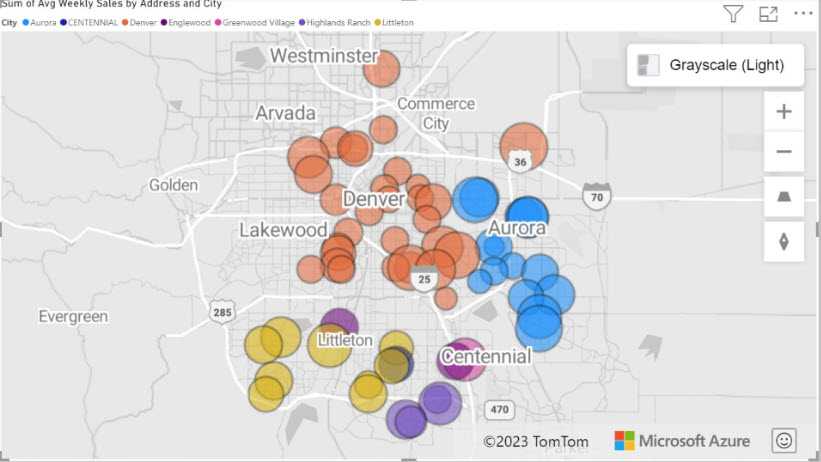 This visualization is suitable when you need not only to plot data points on a map but also to leverage Azure's cloud-based location services for more in-depth geographic analysis, such as calculating routes, visualizing traffic conditions, or creating heatmaps based on the intensity of activity in different areas. It's a powerful tool for scenarios requiring a combination of mapping and intricate spatial operations.