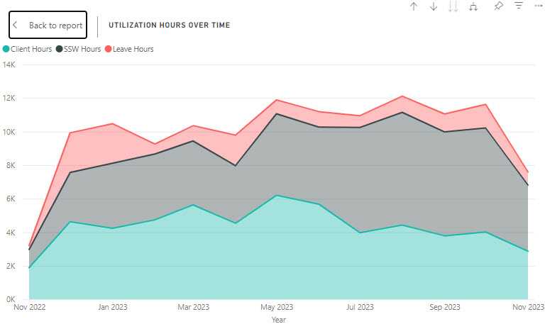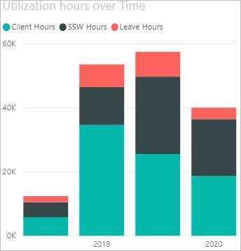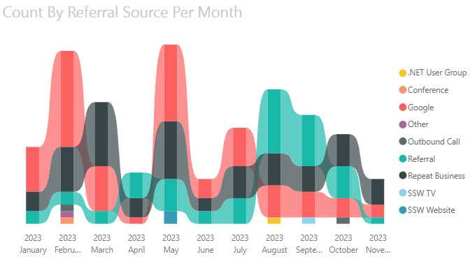 Area charts are excellent for stacked charts because it’s a simple and clear way to clearly portray the cumulative nature of the data. For example, if the above example was visualized with a line chart, it wouldn’t be immediately apparent to the user that the values are added together, not compared against each other.