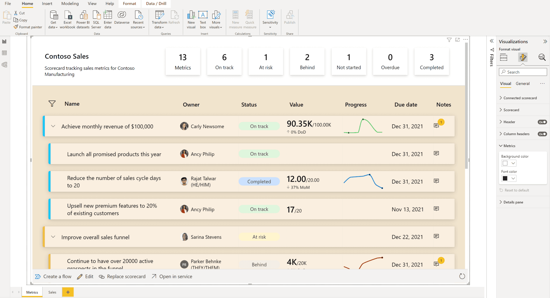 The Metrics visual can combine numbers, charts, and conditional formatting to provide a comprehensive snapshot of performance, making it ideal for dashboards that executives and team leaders use for quick status checks and decision-making.