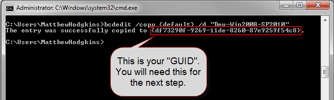 Creating the entry using BCDEdit shows your GUIDFigure - Creating the entry using BCDEdit shows your GUID 4. Type: