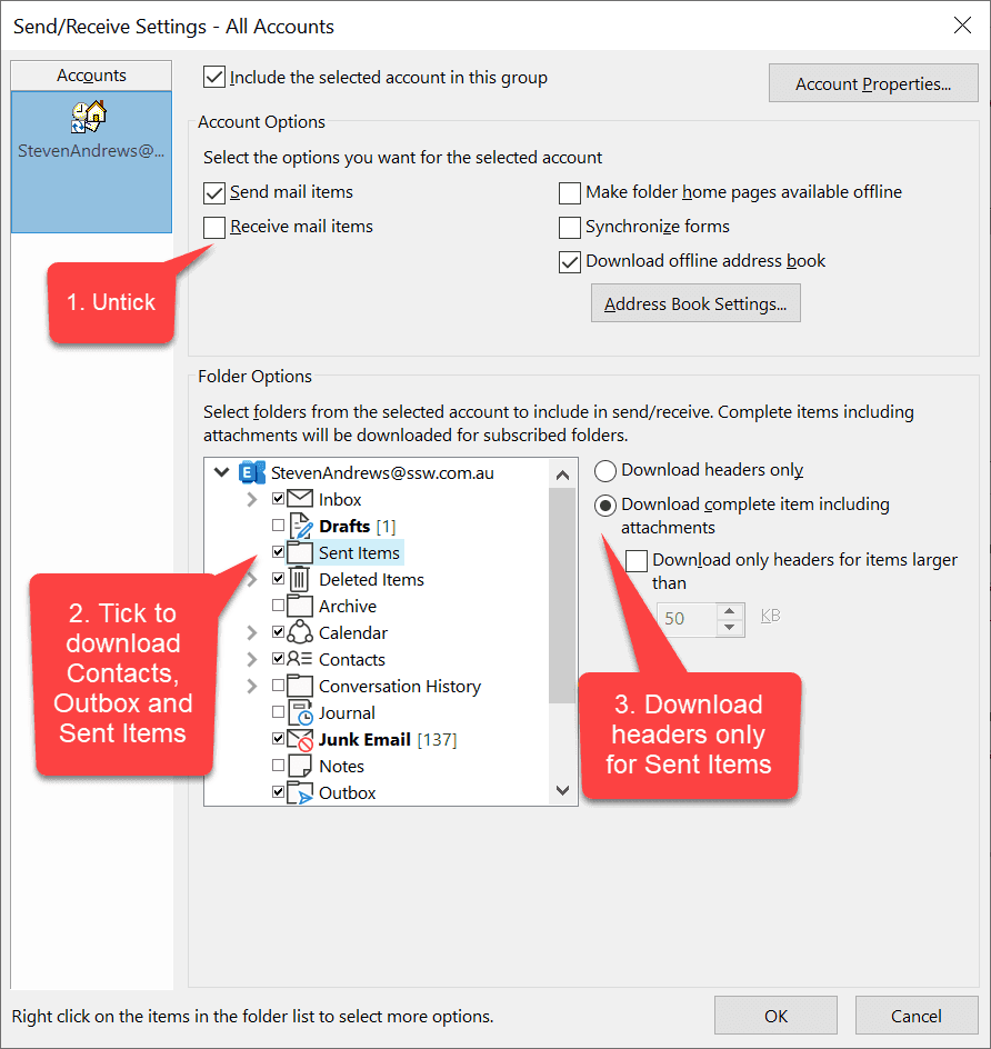 Figure - Untick "Receive mail items" | Tick "Sent Items", "Contacts" and "Outbox" | Download only headers for "Sent Items"