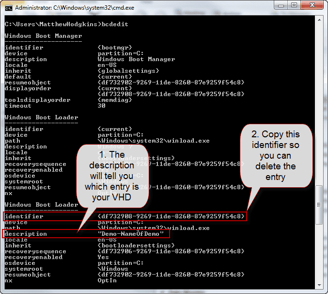 When you have finished with the VHD for the presentation you will want to remove the boot entries that were created for the VHD.