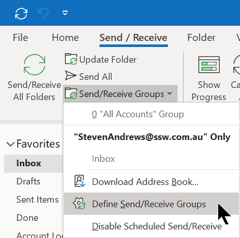 Figure - Click Send / Receive | Click Send / Receive Groups | Click Define Send / Receive Groups