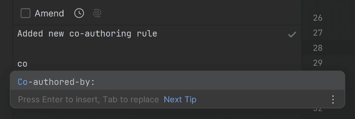 Rider has a great UI that makes creating co-authored commits easy. It provides intellisense for the co-authored commit trailer, and will suggest the names of the people who have access to the git repository.