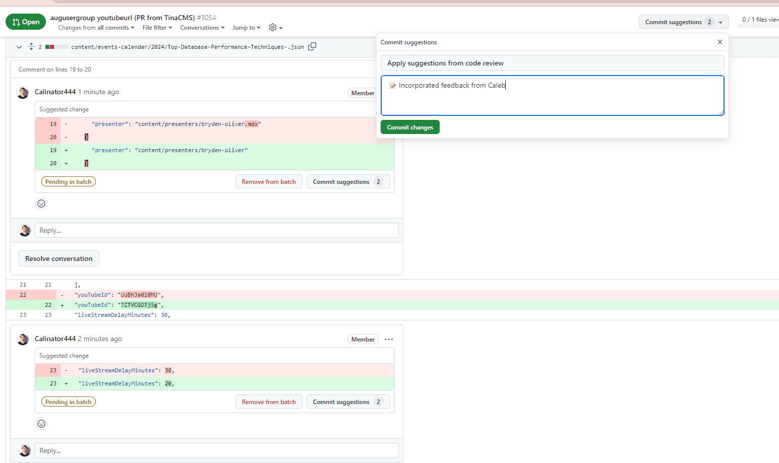Figure: Good example - GitHub - Easy to see what has changed + awesome 'Commit Suggestion' button β¨ If an author has made multiple suggestions to your code it may be best to add the suggestions in a batch and then. This allows you to create a single useful commit message that summarizes the changes in the feedback.