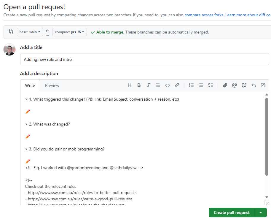 For a great Pull Request template, take a look at @SSWConsulting/SSW.GitHub.Template.