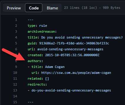 $ git commit -m "Refactor usability tests. > > Co-authored-by: NAME <[email protected]> Co-authored-by: ANOTHER-NAME <[email protected]>"Managing webpages can be challenging, especially in projects with many contributors. When editing a page, a common problem is not knowing who the original author was. This is bad, because it's important not to change something that was there for a reason!