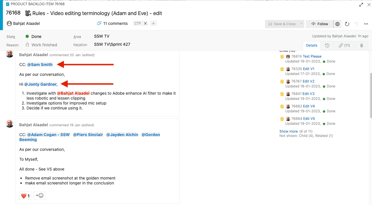 - "Worked with {{ @MENTION(S) }}" (as per pair or mob programming rule)