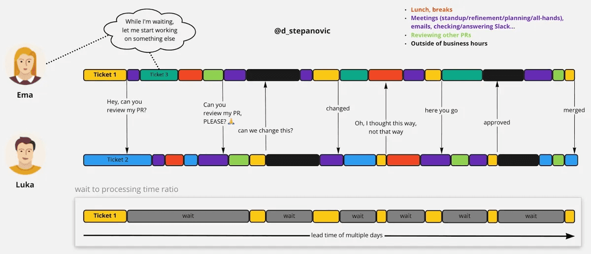 - Eliminates context switching - working on a change together reduces WIP which further increases throughput
