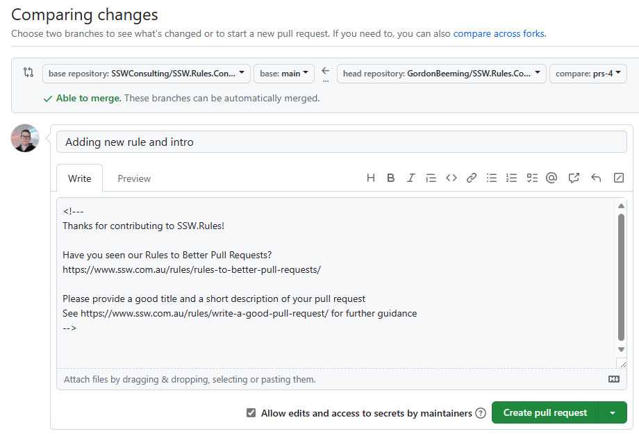 Figure: Good example - This PR template asks for context (to help reviewers), along with guidance links for creating great PRs β Tip: You can use comments in the Markdown as above. These comments will not show when the PR is created, and is only visible when editing the description.