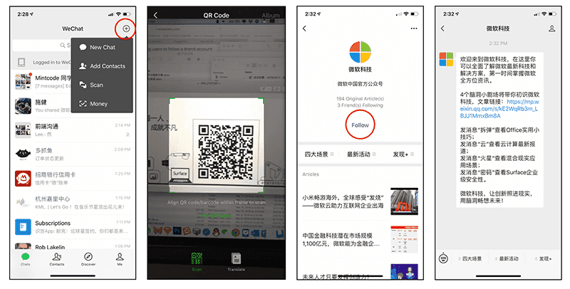Customers - WeChat allows users to follow a Business/Brand account upon scanning (using the built-in QR scanner). QR codes aren’t just used online, but also in a store or on business cards to save you typing in a URL.