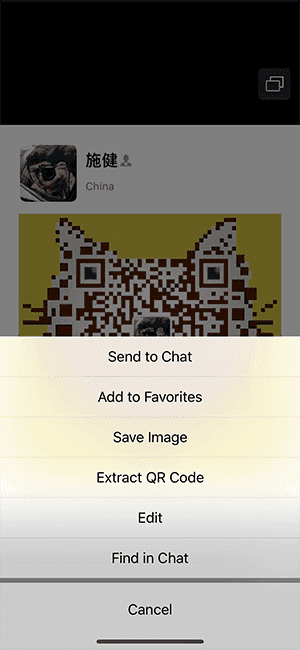 Figure: Tap and hold on a QR image to extract a QR code 3. Use a QR code to receive money in Alipay