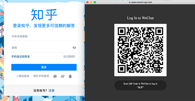 Figure: Use WeChat to sign-up and login to Zhihu (a Chinese Quora alternative) Some social networks also offer login by scanning a QR code using the network’s own app instead of entering a username and a password.