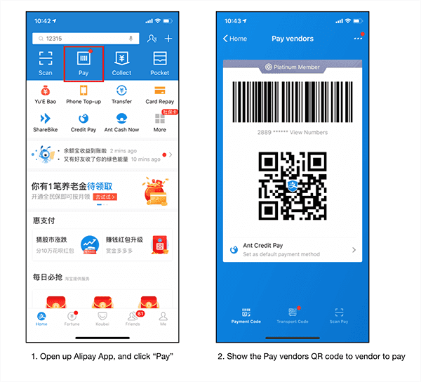 Figure: How to show your "Pay me" QR code on Alipay 4. Use a QR code to make a payment offline by using WeChat and Alipay