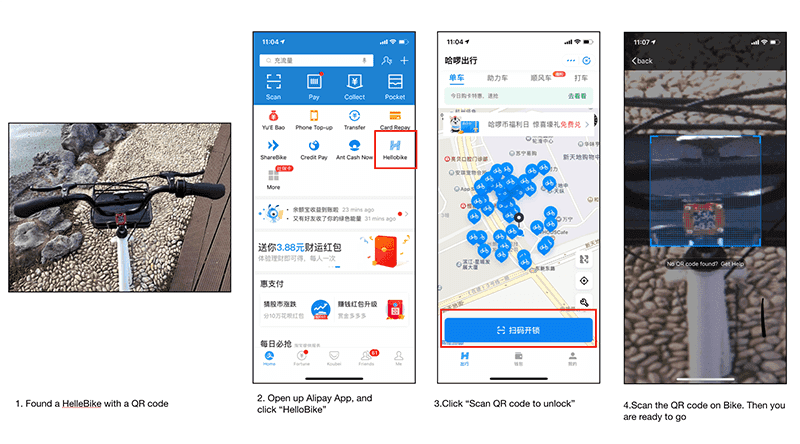 Figure: How to rent a Hellobike using the Alipay App Note: Make sure you have funds available in your Alipay account.