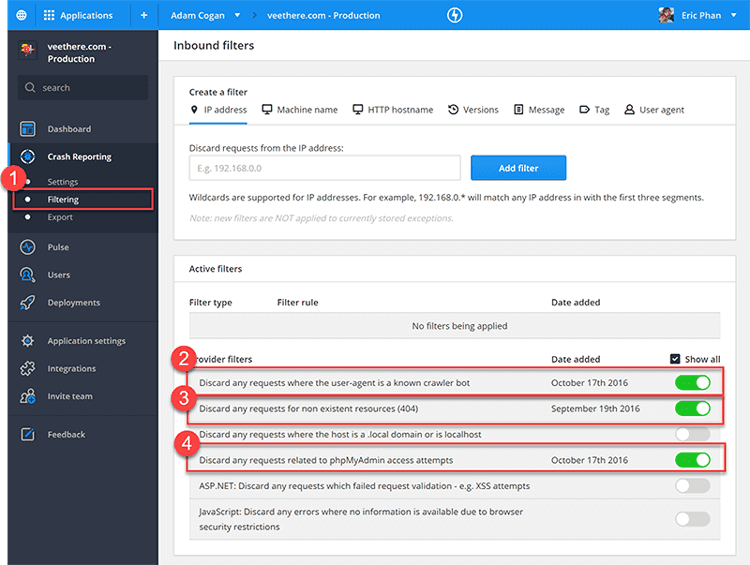 - Under Crash Reporting > select Filtering